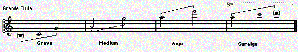 Grande Flûte (Fl.): Grave : (Si2)* Do3 -> Sol#3 Médium : La3 -> Sol#4 Aigu : La4 -> Sol#5 Suraigu : La5 -> Do6